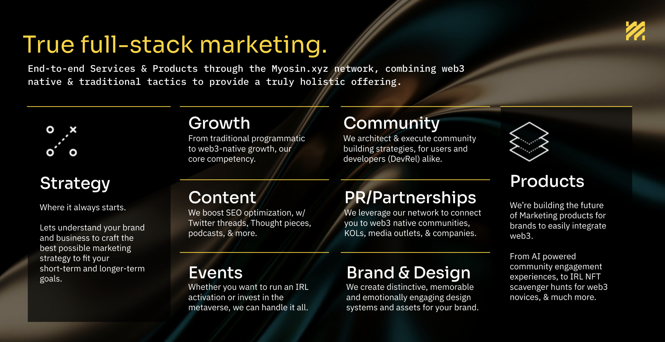 Myosin is a headless growth marketing DAO and product studio, comprised of the best growth marketers, strategists, hackers, designers, and web3 experts.&#x20;