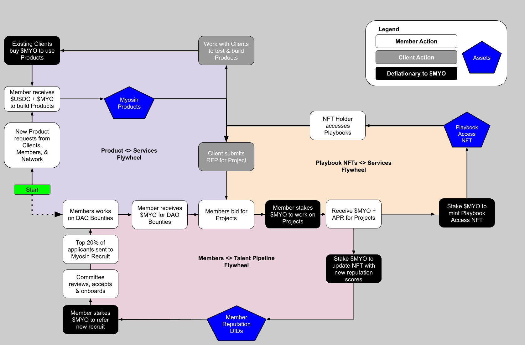 Below is a diagram mapping how the $MYO community token will power within the Myosin network. There are three distinct growth flywheels which give us a compounding advantage over time: